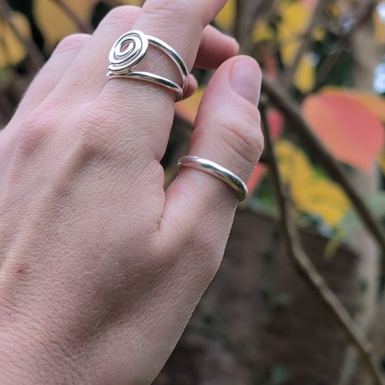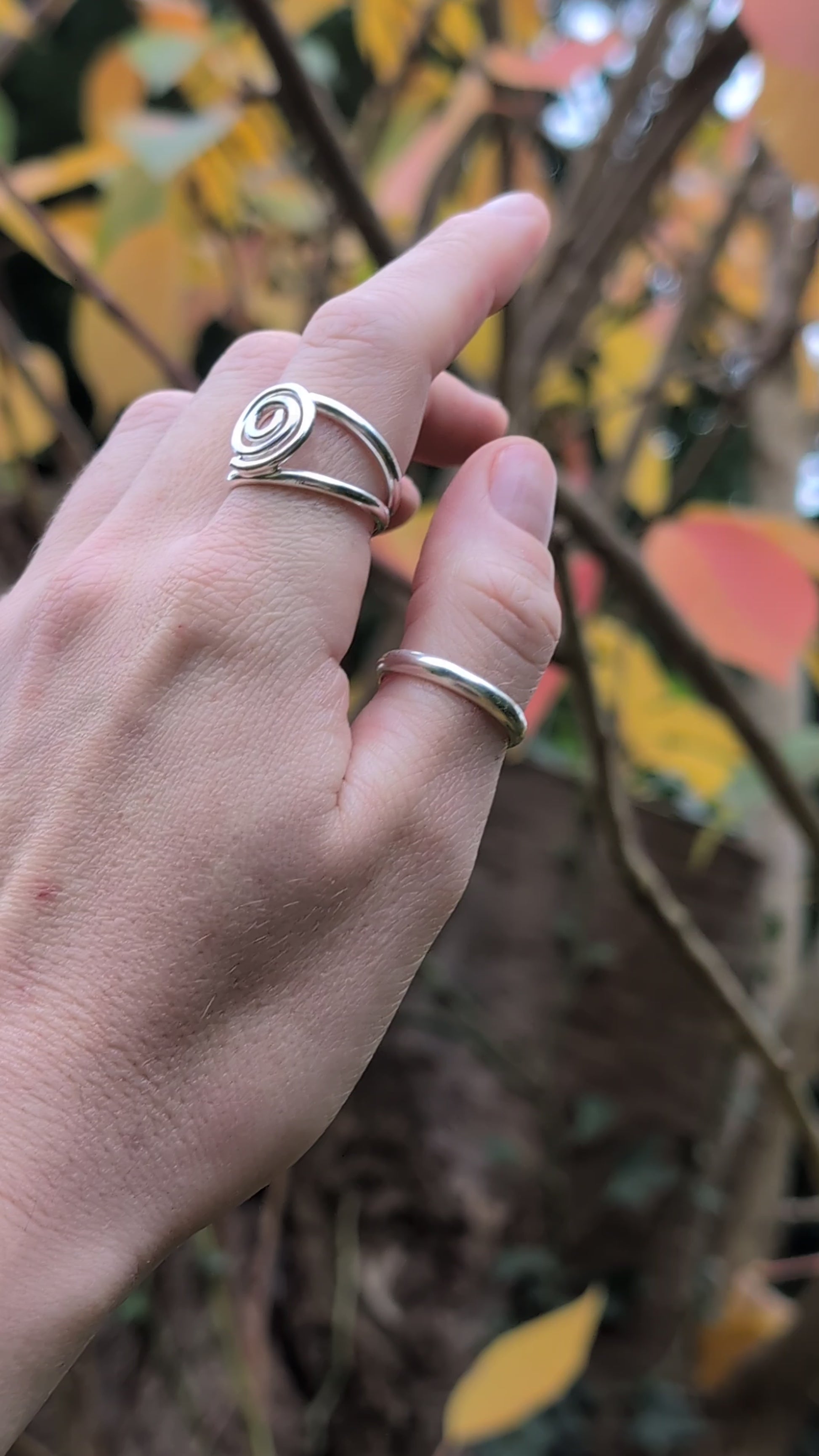 Made to order from sterling silver, featuring a double ring band and handmade spiral.